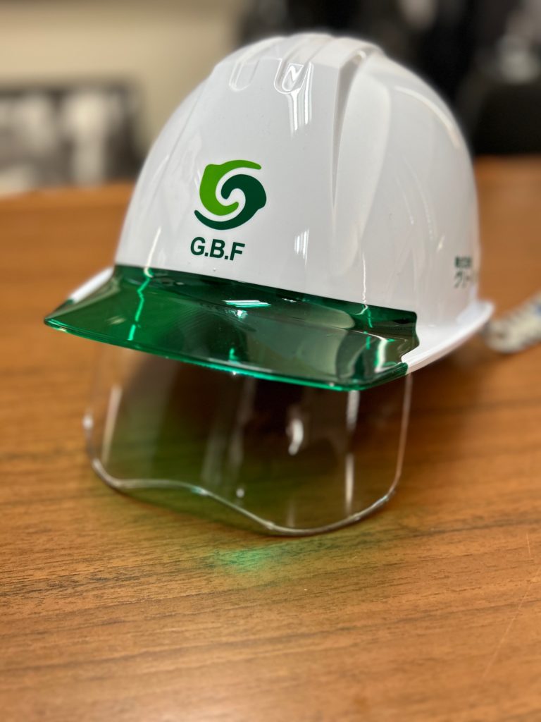 いつもありがとうございます。 シールド付きヘルメット に ロゴと社名加工! バイザーのグリーンとロゴのグリーンを合わせ ナイスセンスですね! -